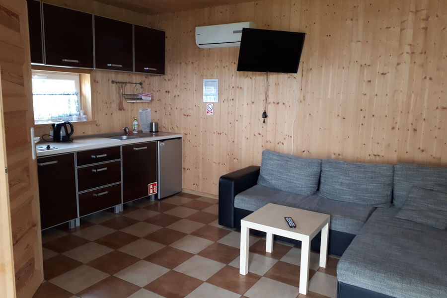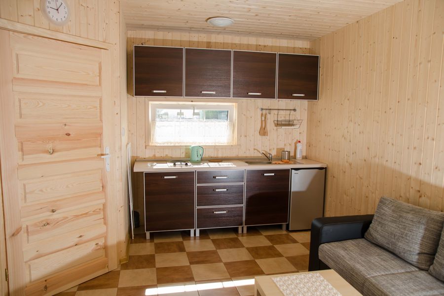 Każdy domek posiada łazienkę lub toaletę, w pełni wyposażoną kuchnię, TV, Internet, taras z meblami.