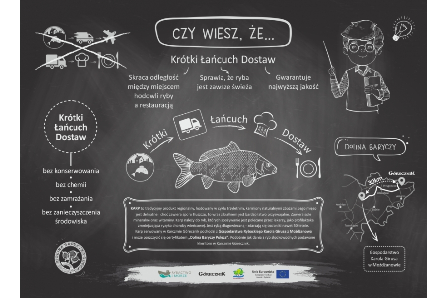Karp podawany w naszej Karczmie hodowany jest w cyklu trzyletnim i karmiony wyłącznie naturalnymi zbożami. Proces chowu opiera się na metodzie Dubisza. W Gospodarstwie Karola Girusa prowadzony jest pełen cykl produkcyjny z wykorzystaniem własnego stada tarlaków. Gdy karpie mają już odpowiednią wielkość oraz gramaturę właściciel Gospodarstwa Rybackiego w Możdżanowie Karol Girus łowi je i dostarcza do naszej kuchni. Teraz już wiecie, dlaczego Krótki Łańcuch Dostaw to jedyne słuszne rozwiązanie i dlaczego na Góreczniku z tego rozwiązania korzystamy.