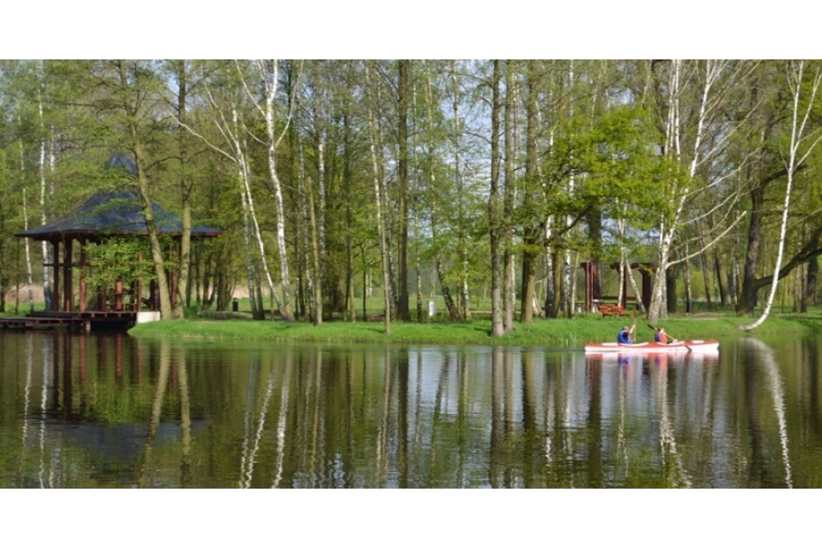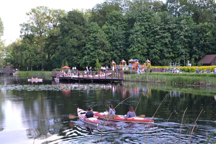 Możliwość pływania kajakami po stawach w otoczeniu pięknego zabytkowego parku romantycznego .