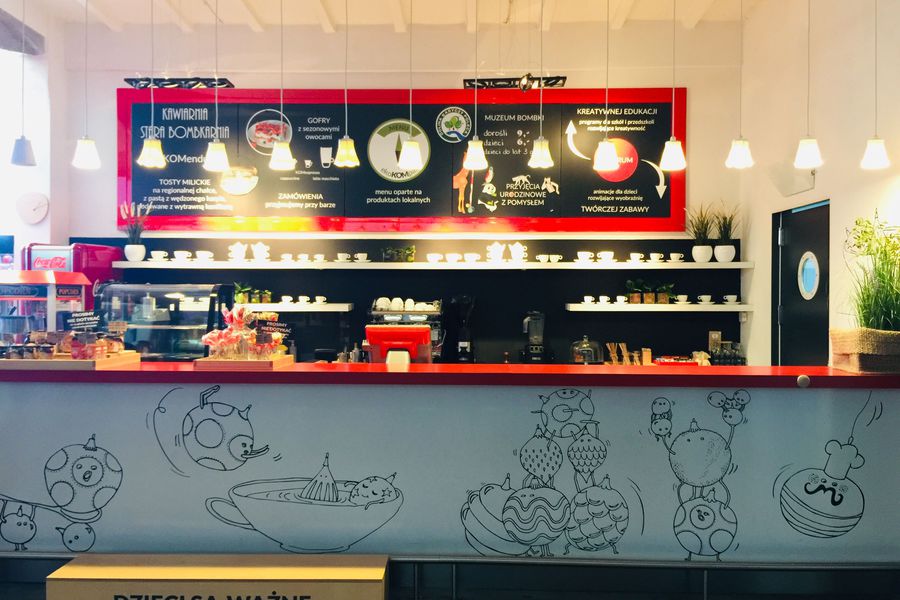 W obszernej, postindustrialnej przestrzeni połączyliśmy pięknie zaprojektowane, przyjazne bistro z kreatywną strefą dla dzieci. W KOM czekają na Was chwile pełne rozkosznych smaków i emocjonujące momenty podczas rozgrywek gier planszowych. Specjalnością Starej Bombkarni jest Tost Milicki – bomba smaków regionalnych – na wytrawnej chałce, z pastą z wędzonego karpia. Turyści wybierają KOM na wygodny start w Dolinę Baryczy ze względu na duży, ogrodzony parking i bezpośrednią lokalizację przy malowniczej ścieżce rowerowej, na trasie dawnej kolejki wąskotorowej. Rozpoczynając wyprawę po nadbaryckich szlakach, w Kawiarni Stara Bombkarnia można się zaopatrzyć w komplet map i informatorów turystycznych oraz świeży prowiant, bogaty w lokalne produkty. Przy Kawiarni działa kultowy Fish Truck, w którym klienci mogą posilić się daniami na bazie karpia i produktów lokalnych ze znakiem Dolina Baryczy Poleca.
