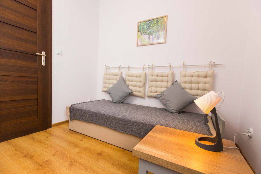 1 apartament z łóżkiem małżeńskim. 3 pokoje gościnne w podwyższonym standardzie „Wygodnym” znajdują się na piętrze i są idealnym rozwiązaniem dla rodzin z małymi dziećmi, a także dla par. Mogą pomieścić 8 osób. W 2 świeżo wyremontowanych pokojach znajdują się podwójne łóżka oraz łazienki. W apartamencie natomiast znajdziesz dodatkowy pokój z łóżkiem idealny dla dzieci. Dwa dodatkowe pokoje w standardzie „Wygodnym” na piętrze to propozycja dla par. W podwójnym łóżku spokojnie przenocują także członkowie tej samej rodziny. Dwa pokoje na parterze pomieszczą 3-4 osoby.