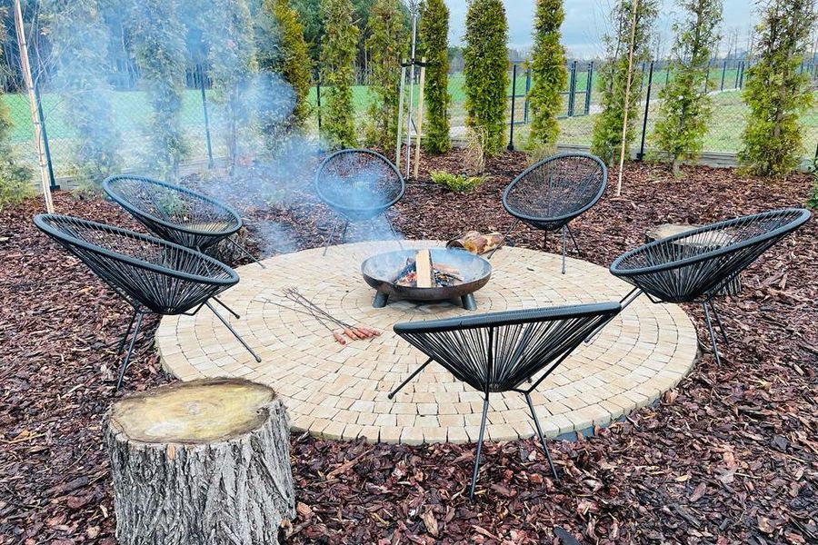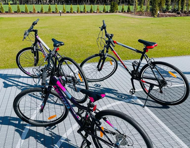 Rowery, sauna, balia, boisko do koszykówki, strefa ogniska, grill, sprzęt do badmintona , gry towarzyskie, książki, informatory, kolorowanki dla dzieci oraz plac zabaw.