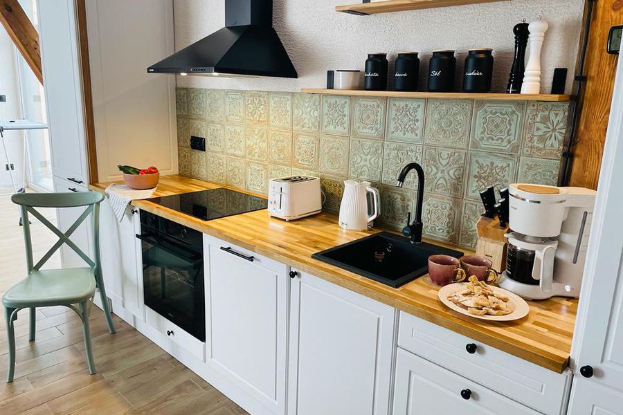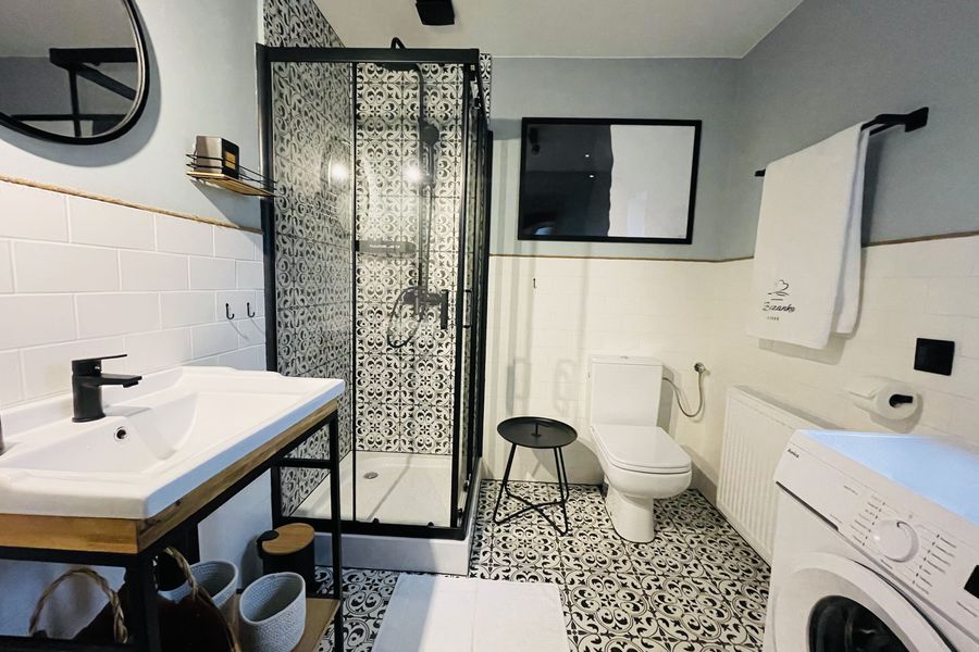 Komfortowe łazienki wyposażone w prysznic, umywalkę, toaletę. Każdy budynek posiada kominek, stół biesiadny, w pełni wyposażony aneks kuchenny , ekspres do kawy , lodówkę , zmywarkę, czajnik elektryczny, płytę indukcyjna, piekarnik. Dodatkowe wyposażenie: żelazko, deska do prasowania, pralka, sejf, apteczka, rzutnik z ekranem , 65-calowy telewizor z usługą Netflix. Na wyposażeniu pokoi znajduje się hotelowa pościel, ręczniki kąpielowe oraz ręczniki do sauny , zestawy kosmetyków.