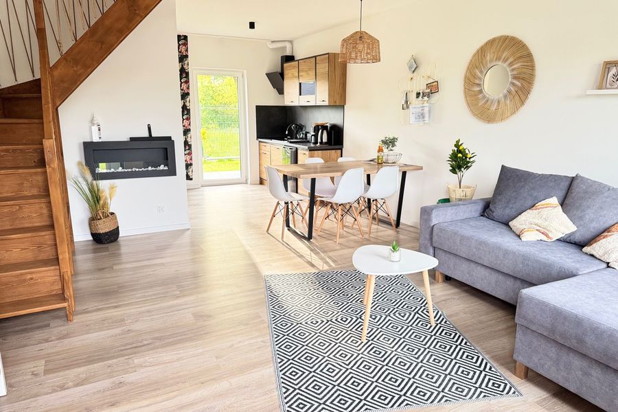 • Wygodne łóżka z wysokiej jakości materacami, zapewniające komfortowy sen. • Przytulna strefa wypoczynkowa z sofą, stolikiem kawowym i telewizorem. • Stylowe, naturalne materiały nawiązujące do charakteru regionu. W pełni wyposażona kuchnia lub aneks kuchenny • Płyta grzewcza, lodówka, czajnik, ekspres do kawy. • Komplet naczyń, sztućców i akcesoriów kuchennych. • Stół jadalniany, idealny do wspólnych posiłków. Komfortowa łazienka • Prysznic z nowoczesnym systemem natryskowym. • Suszarka do włosów i zestaw ręczników. Nowoczesne udogodnienia • Bezpłatne Wi-Fi o wysokiej prędkości. • Telewizor • Klimatyzacja i ogrzewanie, zapewniające komfort przez cały rok • Miejsce do przechowywania rowerów i sprzętu sportowego. • Możliwość wypożyczenia rowerów (opcjonalnie). • Informacje o trasach turystycznych i atrakcjach regionu. 6. Taras • Możliwość relaksu na świeżym powietrzu z widokiem na przyrodę Doliny Baryczy. • Meble ogrodowe do odpoczynku na tarasie. • Łóżeczko dziecięce i krzesełko do karmienia.