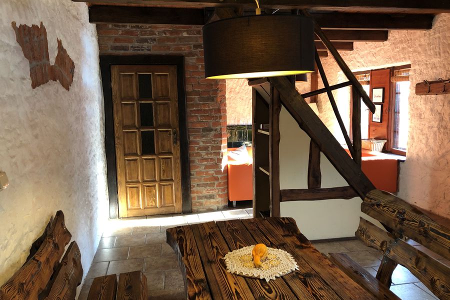 Każdy apartament jest w pełni wyposażony, w tym część kuchenna w kompletny sprzęt kuchenny i zastawę (garnki, naczynia, szkło, otwieracze itp.), w łazience ręczniki - tak, aby nic nie trzeba było przywozić ze sobą. W każdym apartamencie na parterze (ok. 40 m.kw) jest kuchnia z jadalnią, salonik kominkowo-wypoczynkowy, umeblowany taras od południa i łazienka z prysznicem). Drewno do kominka w cenie pobytu. (40 m.kw. ze skosami) część sypialna z podwójnym łóżkiem w jednej części, rozkładaną kanapą w drugiej części oraz drugą łazienką z WC i bidetem. Dodatkowo apartament środkowy posiada umeblowaną werandę na piętrze z widokiem na las. Zapewniamy pościel i ręczniki.